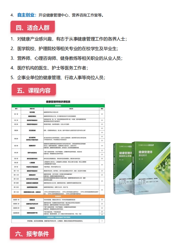 1.对健康产业感兴趣,有志于从事健康管理工作的各界人士; 2.医学院校、护理院校等相关专业的在校学生及毕业生; 3.营养师、心理咨询师、健身教练等相关职业的从业人员; 4.医疗机构的医生、护士等医务工作者; 5.企事业单位的健康管理、行政人事等岗位人员;